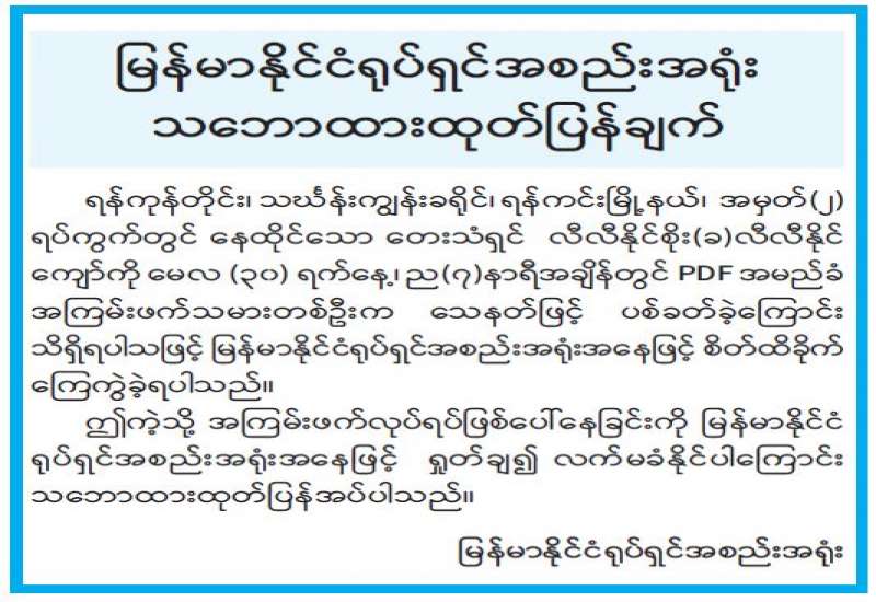 နိုင်ငံတော်စီမံအုပ်ချုပ်ရေးကောင်စီသည် PDF အပါအဝင် အဖွဲ့အစည်းအမျိုးမျိုးအမည်ခံ၍ လက်နက်ကိုင်ဆန့်ကျင်လျက်ရှိသည့် အဖွဲ့အစည်းများအတွင်း ရောက်ရှိနေသူများအား ဥပဒေ ဘောင်အတွင်းသို့ ပြန်လည်ဝင်ရောက်ရန် ဖိတ်ခေါ်လျက်ရှိပြီး ယင်းသို့ပြန်လည်ဝင်ရောက်လာသူများအား လိုအပ်သည့် ကူညီပံ့ပိုးမှုများ ဆောင်ရွက်ပေးလျက်ရှိသလို လက်နက်ခဲယမ်းများဖြင့် ဝင်ရောက်လာသူများကိုလည်း ပါရှိလာသည့် လက်နက်ခဲယမ်းများအလိုက် ဆုကြေးငွေများ ထောက်ပံ့ပေးလျက်ရှိသည်။