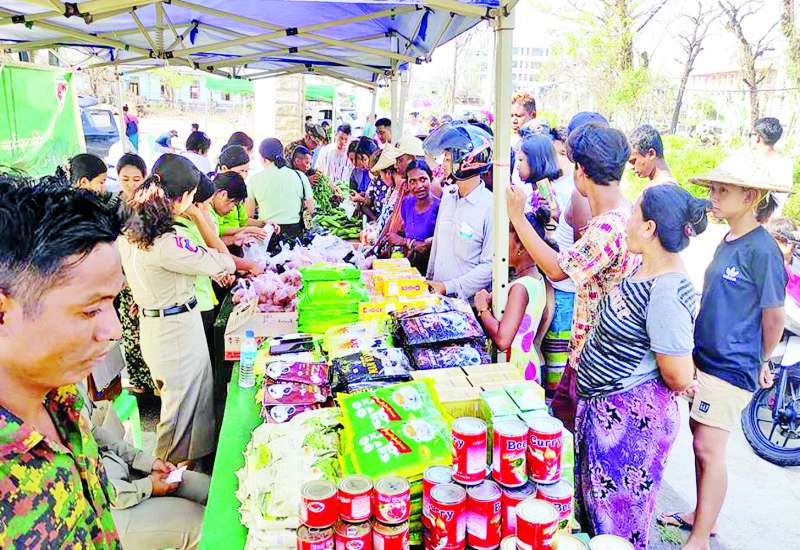ဆိုင်ကလုန်းမုန်တိုင်း (မိုခါ)တိုက်ခတ်မှုကြောင့် ပျက်စီးဆုံးရှုံးမှုများဖြစ်ပေါ်ခဲ့သည့် စစ်တွေမြို့ရှိ မုန်တိုင်းဒဏ်သင့် ဒေသခံပြည်သူများနှင့် ဌာနဆိုင်ရာဝန်ထမ်းများ၏ စားသောက်ရေး အဆင်ပြေစေရန်နှင့် မိမိတို့အလိုရှိရာ စားသောက် ကုန်ပစ္စည်းများကို ဈေးနှုန်း သက်သာစွာဖြင့် ဝယ်ယူ စားသောက်နိုင်ရေးအတွက် အနောက်ပိုင်းတိုင်း စစ်ဌာနချုပ် နယ်မြေခံတပ်မတော်သားများနှင့် တာဝန်ရှိသူများက ယနေ့တွင် စစ်တွေမြို့ ဦးဥတ္တမပန်းခြံ၌