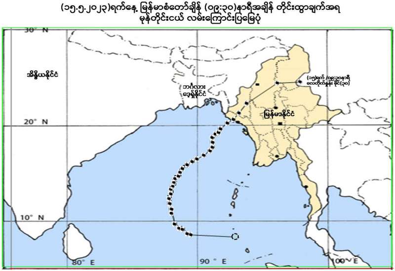 (၁) ယနေ့မြန်မာစံတော်ချိန် (၀၉:၃၀)နာရီအချိန် တိုင်းထွာချက်များအရ စစ်ကိုင်း တိုင်းဒေသကြီးအထက်ပိုင်း၊ ကသာမြို့အနီးမှ ကုန်းတွင်းသို့ ရွေ့လျားဝင်ရောက် ခဲ့သော ဆိုင်ကလုန်းမုန်တိုင်း(Cyclonic Storm) “မိုခါ” (MOCHA)သည် ကချင်ပြည်နယ်၊ ဗန်းမော်မြို့အနီးမှ အရှေ့-အရှေ့မြောက်ယွန်းယွန်းသို့ ရွေ့လျားခဲ့ပြီး၊ တရုတ်-မြန်မာနယ်စပ်တွင် မုန်တိုင်းငယ်(Depression) အဖြစ်သို့ အားလျော့သွားခဲ့ကာ၊ နောက်(၃)နာရီအတွင်း လေဖိအားနည်းရပ်ဝန်း (Low Pressure Area)အဖြစ် တဖြည်းဖြည်း အားလျော့သွားမည်ဟု ခန့်မှန်း ရပါသည်။