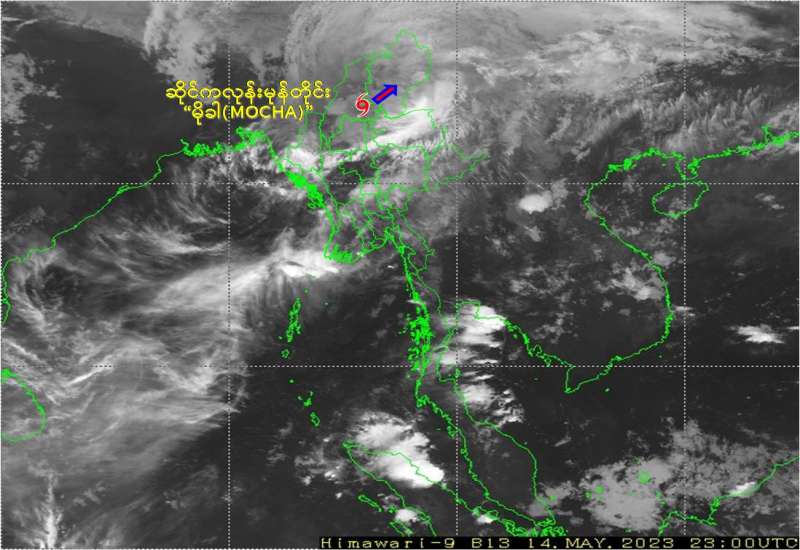 ဘင်္ဂလားပင်လယ်အော်အခြေအနေ။ ယနေ့မြန်မာစံတော်ချိန် (၀၅:၃၀)နာရီအချိန် တိုင်းထွာချက်များအရ ချင်းပြည်နယ်၊ မတူပီမြို့အနီးမှ ကုန်းတွင်းသို့ ရွေ့လျားဝင်ရောက်ခဲ့သော အားကောင်းသောဆိုင်ကလုန်းမုန်တိုင်း(Severe Cyclonic Storm) “မိုခါ”(MOCHA) သည် မြောက်-အရှေ့မြောက်ဘက်သို့ ရွေ့လျားခဲ့ပြီး၊ ဆိုင်ကလုန်းမုန်တိုင်း(Cyclonic Storm) “မိုခါ”(MOCHA) အဖြစ်သို့ အားလျော့သွားခဲ့ကာ စစ်ကိုင်းတိုင်းဒေသကြီးအထက်ပိုင်း၊ ကသာမြို့အနီးမှ မြောက်-အရှေ့မြောက်ဘက်သို့ ဆက်လက် ရွေ့လျားလျက်ရှိပါသည်။ ကပ္ပလီပင်လယ်ပြင်တောင်ပိုင်းတွင် တိမ်အသင့်အတင့် ဖြစ်ထွန်းနေပြီး၊ ကပ္ပလီပင်လယ်ပြင်မြောက်ပိုင်းနှင့် ဘင်္ဂလားပင်လယ်အော်တို့တွင် တိမ်အသင့်အတင့်မှ တိမ်ထူထပ်နေပါသည်။