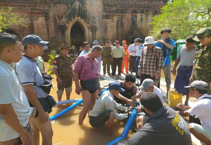မန္တလေးတိုင်းဒေသကြီး ညောင်ဦးမြို့နယ် ပုဂံဒေသတွင်မုန်တိုင်းအကြို မိုးသည်းထန်စွာ ရွာသွန်းလျက်ရှိခြင်းကြောင့် မေ ၁၃ ရက်၊ နံနက်ပိုင်းအချိန်မှစတင်ကာ ရှေးဟောင်းသုတေသနနှင့် အမျိုးသားပြတိုက်ဦးစီးဌာန၊ ပုဂံဌာနခွဲ၊ ပြုပြင်ထိန်းသိမ်းရေးဌာနစုမှ ဒုတိယညွှန်ကြားရေးမှူး ဦးညီမွန်းနှင့် ပြုပြင်ထိန်းသိမ်းရေးဌာနစုမှ အင်ဂျင်နီယာများ၊ နံရံပန်းချီဌာနစိတ် ဝန်ထမ်းများနှင့် ရုံးဝန်ထမ်းများသည် ဇုန်နယ်မြေရှိ ရှေးဟောင်းအဆောက်အအုံများအား ကွင်းဆင်းစစ်ဆေးလျက်ရှိကြောင်း ရှေးဟောင်းသုတေသနနှင့် အမျိုးသား ပြတိုက်ဦးစီးဌာန(ပုဂံဌာနခွဲ)တာဝန်ရှိသူများထံက သိရသည်။