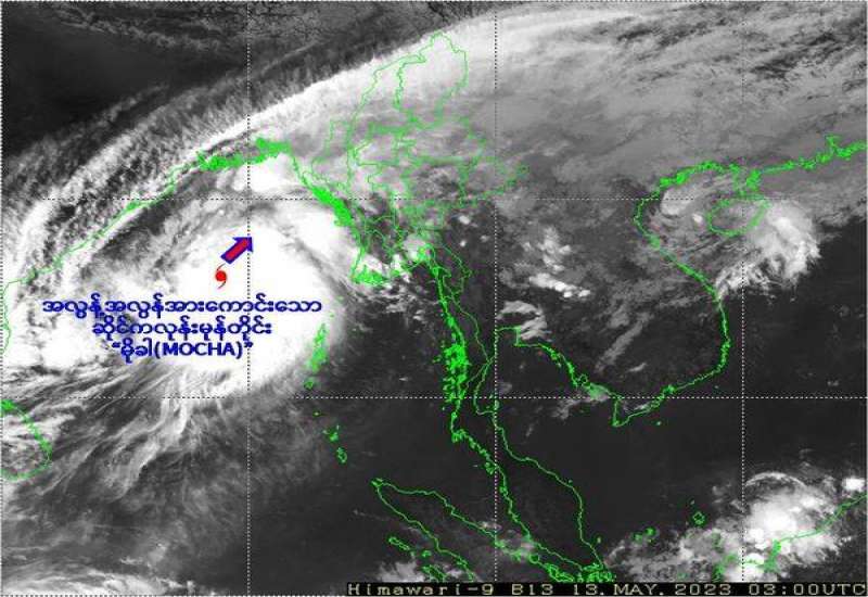 (၂၀၂၃ ခုနှစ်၊ မေလ (၁၃)ရက်နေ့၊ နံနက်(၁၀:၃၀)နာရီအချိန်ထုတ်ပြန်ချက်) ဘင်္ဂလားပင်လယ်အော်အခြေအနေ။ ယနေ့မြန်မာစံတော်ချိန် (၀၉:၃၀)နာရီအချိန် တိုင်းထွာချက်များအရ ဘင်္ဂလားပင်လယ်အော် အရှေ့အလယ်ပိုင်းတွင် ဖြစ်ပေါ်နေသော အလွန့်အလွန်အားကောင်းသောဆိုင်ကလုန်းမုန်တိုင်း(Extremely Severe Cyclonic Storm) “မိုခါ”(MOCHA)သည် မြောက်-အရှေ့မြောက်ဘက်သို့ ရွေ့လျားခဲ့ပြီး၊ မြန်မာနိုင်ငံ၊ ကိုကိုးကျွန်းမြို့(Coco Island)၏ အနောက်-အနောက်မြောက်ဘက် ရေမိုင်(၂၅၅)မိုင်ခန့်၊ ဟိုင်းကြီးကျွန်းမြို့(Hainggyigyun)၏ အနောက်ဘက် ရေမိုင် (၂၉၅)မိုင်ခန့်၊ စစ်တွေမြို့ (Sittwe)၏ အနောက်တောင်ဘက် ရေမိုင် (၃၄၀)မိုင်ခန့်၊ အိန္ဒိယနိုင်ငံ၊ ပို့ပလဲယား(Port Blair)၏ မြောက်- အနောက် မြောက်ဘက် ရေမိုင်(၃၃၀)မိုင်ခန့်နှင့် ဘင်္ဂလားဒေ့ရှ်နိုင်ငံ၊ ကော့ဘဇားမြို့(Cox’s Bazar)၏ တောင်-အနောက်တောင်ဘက် ရေမိုင်(၃၇၅)မိုင်ခန့် အကွာ ပင်လယ်ပြင်ကို ဗဟိုပြုနေပါသည်။ ကပ္ပလီပင်လယ်ပြင်တောင်ပိုင်းတွင် တိမ်အသင့်အတင့် ဖြစ်ထွန်းနေပြီး၊ ကပ္ပလီပင် လယ်ပြင် မြောက်ပိုင်းနှင့် ဘင်္ဂလားပင်လယ်အော်တို့တွင် တိမ်ထူထပ်နေပါသည်။