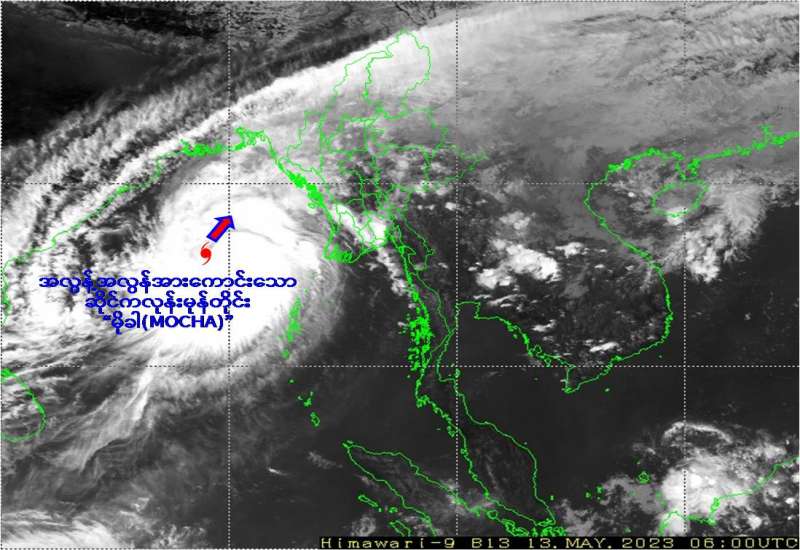 - မိုးလေဝသနှင့် ဇလဗေဒညွှန်ကြားမှုဦးစီးဌာနမှ ယနေ့မြန်မာ စံတော်ချိန် (၁၅ : ၃၀) နာရီအချိန် တိုင်းထွာချက်များအရ ဘင်္ဂလားပင်လယ်အော်အလယ်ပိုင်းနှင့် ယင်းနှင့်ဆက်စပ်လျက်ရှိသော ဘင်္ဂလားပင်လယ်အော်အရှေ့တောင်ပိုင်းတို့တွင် ဖြစ်ပေါ်နေသော အားအလွန်ကောင်းသော ဆိုင်ကလုန်းမုန်တိုင်း (Very Severe Cyclonic Storm) “မိုခါ (MOCHA)” သည် မြောက် - အရှေ့မြောက်ဘက်သို့ ရွေ့လျားခဲ့ပြီး ဘင်္ဂလားပင်လယ်အော်အလယ်ပိုင်းသို့ ရောက်ရှိခဲ့ကာ မြန်မာနိုင်ငံ ကိုကိုးကျွန်းမြို့၏ အနောက်ဘက် ရေမိုင် ၂၉၅ မိုင်ခန့်၊ ဟိုင်းကြီးကျွန်းမြို့၏ အနောက် - အနောက်တောင်ဘက် ရေမိုင် ၃၇၀ မိုင်ခန့်၊ စစ်တွေမြို့၏ တောင် - အနောက်တောင်ဘက် ရေမိုင် ၄၅၀ မိုင်ခန့်၊ အိန္ဒိယနိုင်ငံ ပို့ပလဲယား၏ အနောက်မြောက်ဘက် ရေမိုင် ၃၀၀ မိုင်ခန့်နှင့် ဘင်္ဂလားဒေ့ရှ်နိုင်ငံ ကော့ဘဇားမြို့၏ တောင်-အနောက်တောင်ဘက် ရေမိုင် ၄၉၀ မိုင်ခန့်အကွာ ပင်လယ်ပြင်ကို ဗဟိုပြုနေသည်။ အဆိုပါ အားအလွန်ကောင်းသော ဆိုင်ကလုန်းမုန်တိုင်း “မိုခါ” သည် မြောက်-အရှေ့မြောက်ဘက်သို့ ဆက်လက်ရွေ့လျားနိုင်ပြီး ပိုမိုအားကောင်းလာကာ ယနေ့ညပိုင်းတွင် ဘင်္ဂလား ပင်လယ်အော်အရှေ့အလယ်ပိုင်း၌ အလွန့်အလွန်အားကောင်းသော ဆိုင်ကလုန်းမုန်တိုင်း (Extremely Severe Cyclonic Storm) “မိုခါ” အဖြစ်သို့ ရောက်ရှိနိုင်ပြီး ဘင်္ဂလားဒေ့ရှ်နိုင်ငံ ကော့ဘဇားမြို့နှင့် မြန်မာနိုင်ငံ ကျောက်ဖြူမြို့တို့အကြား စစ်တွေမြို့အနီးမှ ၁၄-၅-၂၀၂၃ ရက်နေ့ နေ့လယ်ပိုင်းတွင် အားအလွန်ကောင်းသော ဆိုင်ကလုန်းမုန်တိုင်း “မိုခါ” အနေဖြင့် ဖြတ်ကျော်ဝင်ရောက်နိုင်သည်ဟု ခန်မှန်း ရပါသည်။