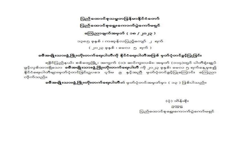 ပြည်ထောင်စုသမ္မတမြန်မာနိုင်ငံတော် ပြည်ထောင်စုရွေးကောက်ပွဲကော်မရှင် ကြေညာချက်အမှတ် ( ၁၈ / ၂၀၂၃ ) ၁၃၈၅ ခုနှစ် ၊ ကဆုန်လပြည့်ကျော် ၂ ရက်(၂၀၂၃ ခုနှစ်၊ မေလ ၅ ရက်) ခမီအမျိုးသားဖွံ့ဖြိုးတိုးတက်ရေးပါတီကို နိုင်ငံရေးပါတီအဖြစ် မှတ်ပုံတင်ခွင့်ပြုခြင်း