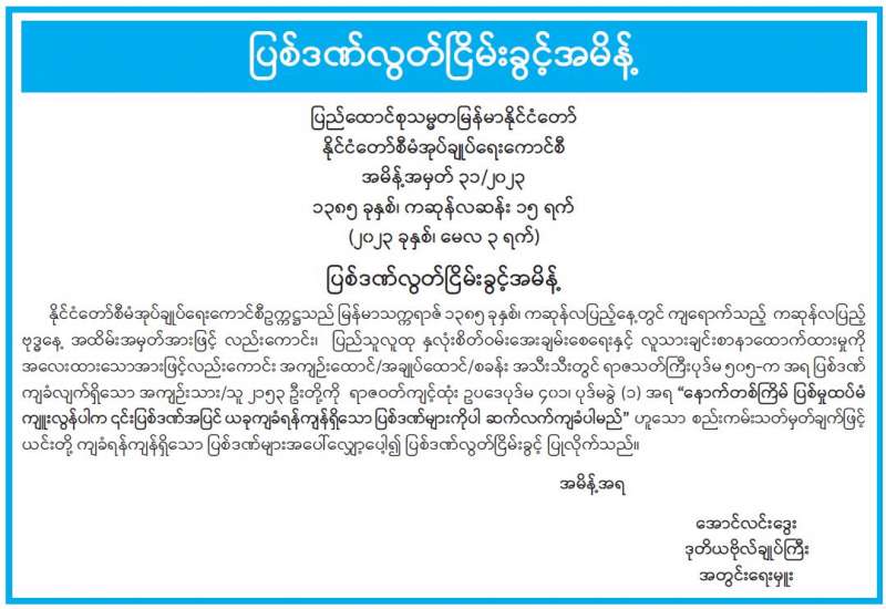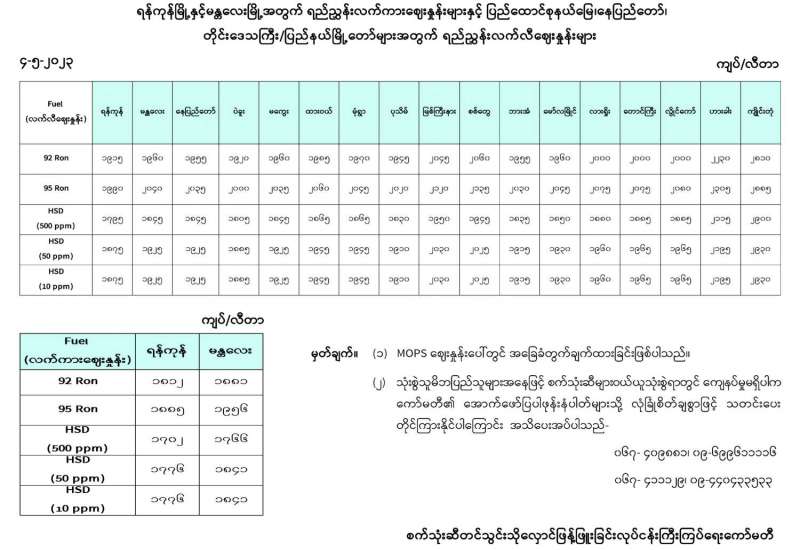 ရန်ကုန်မြို့နှင့် မန္တလေးမြို့အတွက် ရည်ညွှန်းလက်ကားဈေးနှုန်းများနှင့် ပြည်ထောင်စုနယ်မြေ နေပြည်တော်၊ တိုင်းဒေသကြီး/ပြည်နယ် မြို့တော်များအတွက် ရည်ညွှန်းလက်လီဈေးနှုန်းများ