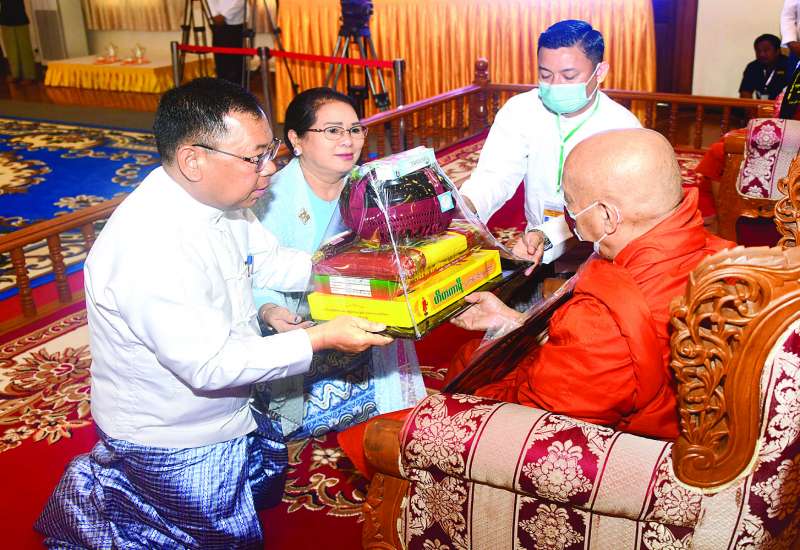 ၂၀၂၃ ခုနှစ် ကဆုန်လပြည့်ဗုဒ္ဓနေ့ အထိမ်းအမှတ် ကုသိုလ်တော်အဖြစ် ဆရာတော်များအား လှူဖွယ်ပစ္စည်းများနှင့် နေ့ဆွမ်းဆက်ကပ်လှူဒါန်းပွဲ အခမ်းအနားကို ယနေ့နံနက်ပိုင်းတွင် နေပြည်တော် ဥပ္ပါတသန္တိစေတီတော်မြတ်ကြီး ပရိဝုဏ်တော်အတွင်းရှိ သာသနာ့မဟာဗိမာန်တော်ကြီး၌ ကျင်းပရာ နိုင်ငံတော်စီမံအုပ်ချုပ်ရေးကောင်စီဥက္ကဋ္ဌ နိုင်ငံတော်ဝန်ကြီးချုပ်ဗိုလ်ချုပ်မှူးကြီး မင်းအောင်လှိုင်နှင့်ဇနီး ဒေါ်ကြူကြူလှတို့ တက်ရောက်ကြည်ညို၍ ဆရာတော်များကို နေ့ဆွမ်းဆက်ကပ်လှူဒါန်းကြသည်။