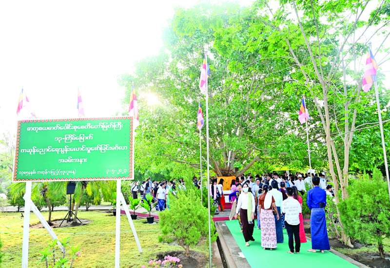 ပြည်ထောင်စုနယ်မြေ နေပြည်တော် ဇမ္ဗူသီရိမြို့နယ်ရှိ ဓာတုစယဓာတ်ပေါင်းစု စေတီတော် မြတ်ကြီးပရိဝုဏ်တော် အရှေ့ဘက်အရပ်ရှိ မဟာဗောဓိညောင်ပင်တော်အား (၁၃)ကြိမ်မြောက် ကဆုန် ညောင်ရေသွန်းလောင်းပူဇော်ခြင်း မင်္ဂလာအခမ်းအနားကို ယနေ့နံနက် ၆ နာရီခွဲတွင် စေတီတော်မြတ် ကြီးပရိဝုဏ်အတွင်း၌ ကျင်းပရာ နေပြည်တော် စည်ပင်သာယာရေးကော်မတီဥက္ကဋ္ဌ မြို့တော်ဝန် ဦးတင်ဦးလွင်၏ဇနီး၊ ဒုတိယမြို့တော်ဝန် ဦးမောင်မောင်၊ အမြဲတမ်းအတွင်းဝန်၊ ဌာနကြီးမှူးများနှင့် ဇနီးများ၊ ဧည့်သည်တော်များ တက်ရောက်ကြည်ညိုကြသည်။
