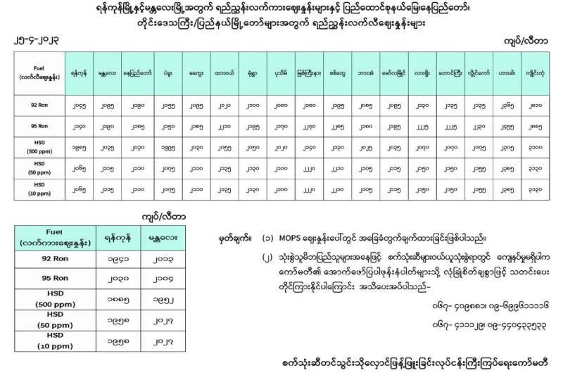 ရန်ကုန်မြို့နှင့် မန္တလေးမြို့အတွက် ရည်ညွှန်းလက်ကားဈေးနှုန်းများနှင့် ပြည်ထောင်စုနယ်မြေ နေပြည်တော်၊ တိုင်းဒေသကြီး/ပြည်နယ် မြို့တော်များအတွက် ရည်ညွှန်းလက်လီဈေးနှုန်းများ