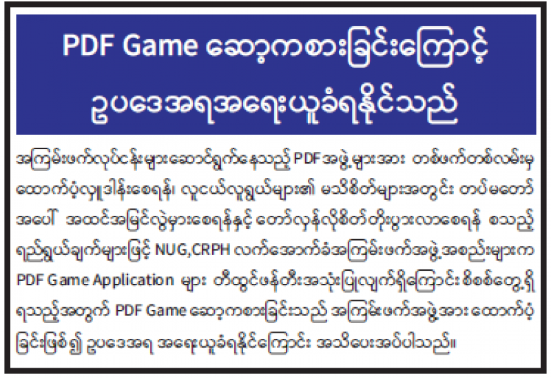 အကြမ်းဖက်အုပ်စုအဖြစ်ကြေညာထားသော CRPH၊ NUG နှင့် ယင်းတို့၏လက်အောက်ခံ အဖွဲ့အစည်းများ၊ ယင်းတို့နှင့်ဆက်နွှယ်နေသော အဖွဲ့အစည်းများ၊ လူပုဂ္ဂိုလ်များသည် နိုင်ငံတော်တည်ငြိမ်အေးချမ်းရေးကို ပျက်ပြားစေရန်နှင့် ပြည်သူလူထုကို အကြောက်တရားများ ဖြစ်ပေါ်စေပြီး အစိုးရယန္တရားများ ပျက်ပြားစေရန် ရည်ရွယ်လျက် လှုံ့ဆော်ခြင်း၊ ဝါဒဖြန့်ခြင်း၊ ခြိမ်းခြောက်ခြင်းများကို လူမှုကွန်ရက်များမှတစ်ဆင့် နည်းမျိုးစုံဖြင့် ပြုလုပ်လျက်ရှိပါသည်။