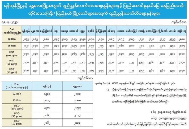 ရန်ကုန်မြို့နှင့် မန္တလေးမြို့အတွက် ရည်ညွှန်းလက်ကားဈေးနှုန်းများနှင့် ပြည်ထောင်စုနယ်မြေ နေပြည်တော်၊ တိုင်းဒေသကြီး/ ပြည်နယ် မြို့တော်များအတွက် ရည်ညွှန်းလက်လီဈေးနှုန်းများ