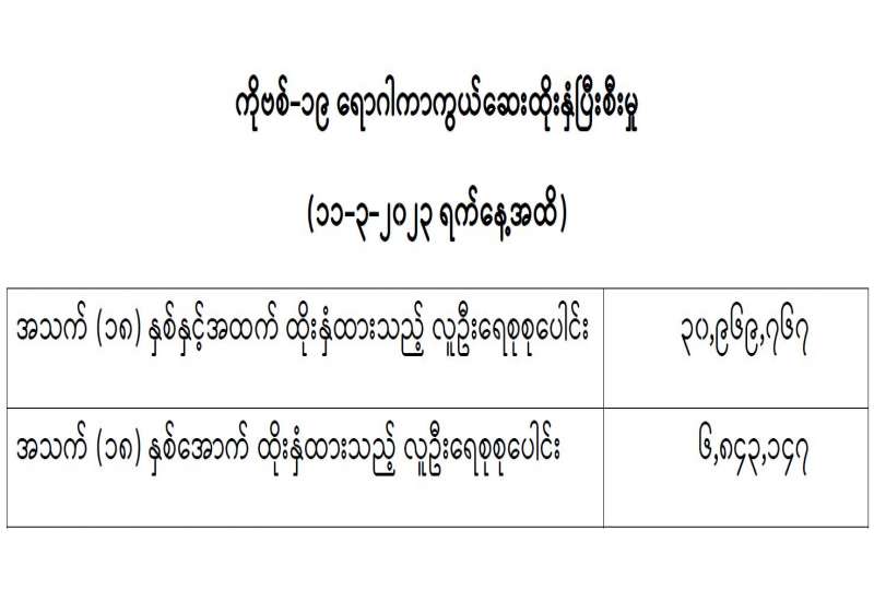 ကျန်းမာရေးဝန်ကြီးဌာနသည် COVID-19 သံသယလူနာများ၊ ဓာတ်ခွဲအတည်ပြုလူနာနှင့် အနီးကပ်ထိတွေ့ခဲ့သူများနှင့် အသွားအလာကန့်သတ်ထားရှိသူများအား COVID-19 ရောဂါ ရှိ၊ မရှိ ဓာတ်ခွဲစစ်ဆေးခြင်း ပုံမှန်ဆောင်ရွက်လျက်ရှိပြီး (၁၁-၃-၂၀၂၃) ရက်နေ့၊ ည (၈:၀၀)နာရီမှ (၁၂-၃-၂၀၂၃)ရက်နေ့၊ ည(၈:၀၀)နာရီအတွင်း ဓာတ်ခွဲနမူနာစုစုပေါင်း (၂,၃၇၁)ခုအား စစ်ဆေးပြီးစီးခဲ့ရာ COVID-19 ရောဂါ ဓာတ်ခွဲအတည်ပြုလူနာသစ်မတွေ့ရှိရပါ။