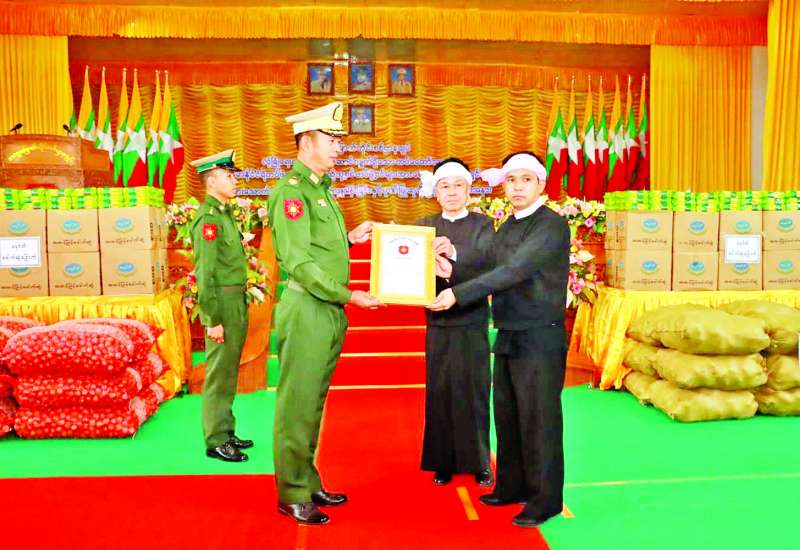 ရှမ်းပြည်နယ်(မြောက်ပိုင်း) အတွင်း လုံခြုံရေး တာဝန်များ ထမ်းဆောင်လျက်ရှိသော တပ်မတော်သားများ၊ မြန်မာနိုင်ငံရဲတပ်ဖွဲ့ဝင်များနှင့် ပြည်သူ့စစ် (ဌာနေ)တပ်ဖွဲ့ဝင်များကို စေတနာရှင်အလှူရှင်များက စားသောက်ဖွယ်ရာများ ဂုဏ်ပြုပေးအပ်ခြင်းကို ယနေ့နံနက်ပိုင်းတွင် အရှေ့မြောက်တိုင်းစစ်ဌာနချုပ်ရှိ တိုင်းခန်းမ၌ပြုလုပ်ရာတိုင်းမှူး ဗိုလ်ချုပ်နိုင်နိုင်ဦးနှင့်အဖွဲ့ဝင်များ၊ ဌာနဆိုင်ရာတာဝန်ရှိသူ များ၊ လုံခြုံရေးတပ်ဖွဲ့ဝင်များနှင့် စေတနာရှင်အလှူရှင်များ တက်ရောက်ကြသည်။