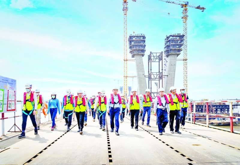 ဆောက်လုပ်ရေးဝန်ကြီးဌာန ပြည်ထောင်စုဝန်ကြီး ဦးမျိုးသန့်သည် ညွှန်ကြားရေးမှူးချုပ်များ၊ တာဝန်ရှိသူများနှင့်အတူ ယနေ့တွင် မြန်မာ-ကိုရီးယား ချစ်ကြည်ရေး(ဒလ)မြစ်ကူးတံတားတည်ဆောက်ရေးစီမံကိန်း ရန်ကုန်ဘက်ခြမ်းလုပ်ငန်းခွင်သို့ရောက်ရှိရာ စီမံကိန်းကြီးကြပ်ရေး အဖွဲ့ခေါင်းဆောင် ဒုတိယညွှန်ကြားရေးမှူးချုပ် ဦးကျော်ကောင်းချိုက တံတားစီမံကိန်းလျာထားချက်နှင့် ဆောင်ရွက်ပြီးစီးမှု၊ ရန်ကုန်ဘက်ခြမ်းဘုန်းကြီး လမ်းတစ်လျှောက် ချဉ်းကပ်တံတားလုပ်ငန်းများ ဆောင်ရွက်ပြီးစီးမှုနှင့်ဆင်ခြေလျှောတံတားနှစ်စင်း ဆောင်ရွက်ထားရှိမှုတို့ကို ရှင်းလင်းတင်ပြသည်။