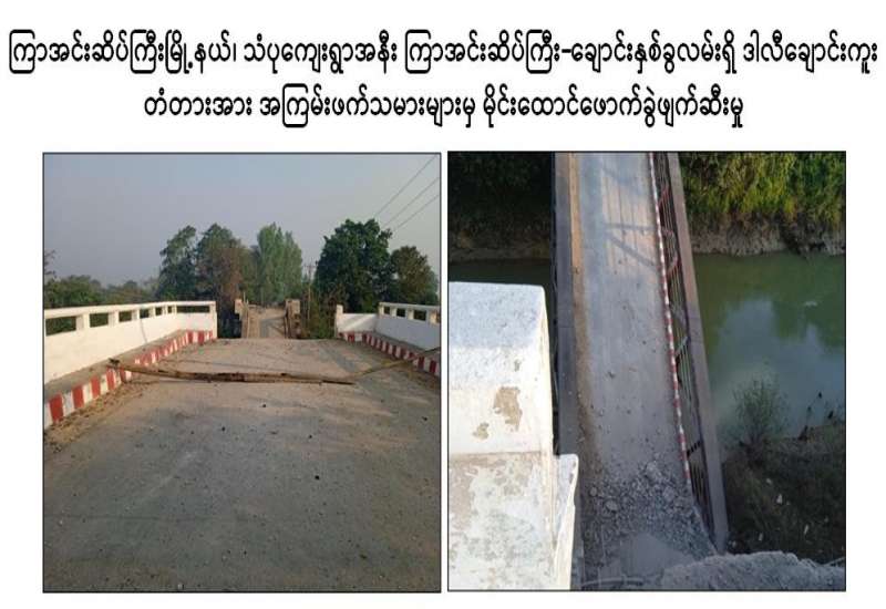 ကရင်ပြည်နယ်၊ ကြာအင်းဆိပ်ကြီးမြို့နယ်၊ သံပုကျေးရွာအနီး ကြာအင်းဆိပ်ကြီး-ချောင်းနှစ်ခွ လမ်းရှိ ဒါလီချောင်းကူးတံတားအား အကြမ်းဖက်မှုကို လိုလားသည့် အကြမ်းဖက်အဖွဲ့နှင့် PDF အမည်ခံ အကြမ်းဖက်သမားများက မိုင်းထောင်ဖောက်ခွဲဖျက်ဆီးခဲ့သည်။
