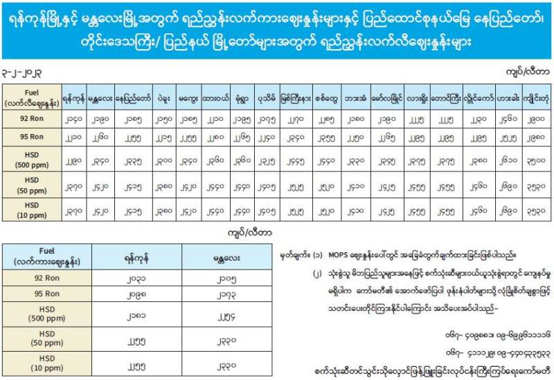 ရန်ကုန်မြို့နှင့် မန္တလေးမြို့အတွက် ရည်ညွှန်းလက်ကားဈေးနှုန်းများနှင့် ပြည်ထောင်စုနယ်မြေ နေပြည်တော်၊ တိုင်းဒေသကြီး/ ပြည်နယ်မြို့တော်များအတွက် ရည်ညွှန်းလက်လီဈေးနှုန်းများ