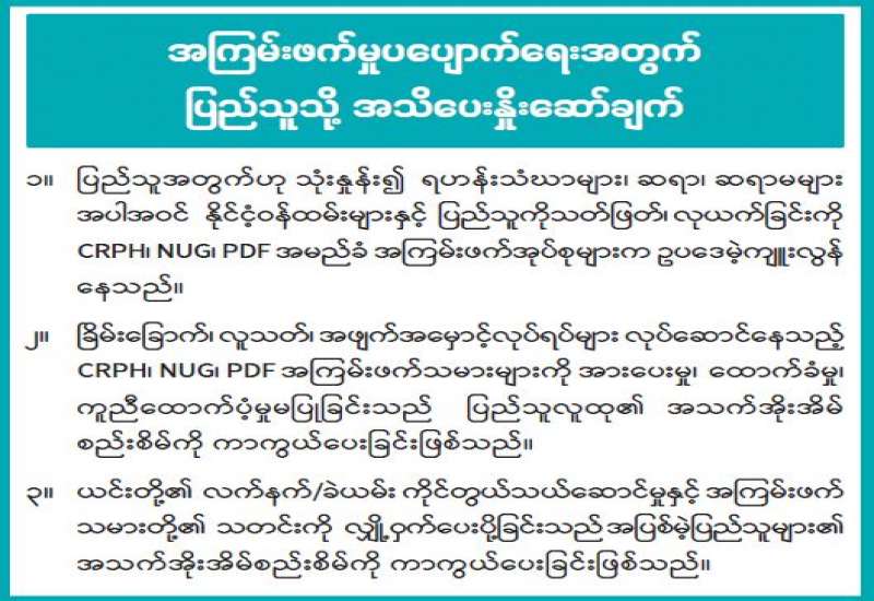 အကြမ်းဖက်အုပ်စုအဖြစ် ကြေညာထားသော CRPH ၊ NUG နှင့် ယင်းတို့၏ လက်အောက်ခံအဖွဲ့အစည်းများ၊ ယင်းတို့နှင့် ဆက်နွှယ်နေသောအဖွဲ့အစည်းများ၊ လူပုဂ္ဂိုလ်များသည် နိုင်ငံတော်တည်ငြိမ်အေးချမ်းရေးကို ပျက်ပြားစေရန်နှင့် ပြည်သူလူထုကို အကြောက်တရားများဖြစ်ပေါ်စေပြီး အစိုးရယန္တရားများပျက်ပြားစေရန် ရည်ရွယ်လျက် လှုံ့ဆော်ခြင်း၊ ဝါဒဖြန့်ခြင်း၊ ခြိမ်းခြောက်ခြင်းများကို လူမှုကွန်ရက်များမှတစ်ဆင့် နည်းမျိုးစုံဖြင့် ပြုလုပ်လျက်ရှိသည်။