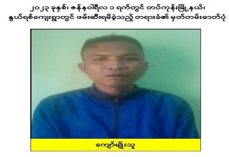 နိုင်ငံတော်အစိုးရမှ အကြမ်းဖက်အုပ်စုအဖြစ် ကြေညာထားသည့် NUG၊ CRPH နှင့် PDF အမည်ခံအကြမ်းဖက်အဖွဲ့များသည် ပြည်သူအတွက်ဟုသုံးနှုန်း၍ ရဟန်းသံဃာများ၊ ဆရာ၊ ဆရာမများအပါအဝင် နိုင်ငံ့ဝန်ထမ်းများနှင့် ပြည်သူများကို ရက်စက်စွာ လုပ်ကြံသတ်ဖြတ်ခြင်း၊ လုယက်ခြင်းများကို ဥပဒေမဲ့ကျူးလွန်လျက်ရှိသည်။ ထို့အပြင် PDF အမည်ခံ အကြမ်းဖက်အဖွဲ့များသည် လွတ်လပ်ရေးနေ့တွင် အပြစ်မဲ့ပြည်သူများအား ထိတ်လန့်ကြောက်ရွံ့စေရန် နေပြည်တော်ကောင်စီနယ်မြေအတွင်း၌ အများပြည်သူများ စုဝေးလျက်ရှိသည့်နေရာများတွင် ယုတ်မာရက်စက်သောအကြံဖြင့် ဖောက်ခွဲဖျက်ဆီးခြင်းများလုပ်ဆောင်ရန် စီစဉ်လျက်ရှိကြောင်း အကြမ်းဖက်မှုကို မလိုလားသည့် ပြည်သူများ၏ သတင်းပေးပို့ချက်အရ ၂၀၂၃ ခုနှစ်၊ ဇန်နဝါရီလ ၁ ရက်နံနက်ပိုင်းတွင် နေပြည်တော်ကောင်စီနယ်မြေ၊ တပ်ကုန်းမြို့နယ်၊ နွယ်ရစ်ကျေးရွာ၌ တပ်ကုန်း PDF အမည်ခံအကြမ်းဖက်အဖွဲ့နှင့်ဆက်သွယ်၍ အကြမ်းဖက်လုပ်ငန်းများ ဆောင်ရွက်ရန် စီစဉ်လျက်ရှိသော ကျော်မျိုးသူ အား ဖမ်းဆီးရမိခဲ့သည်။