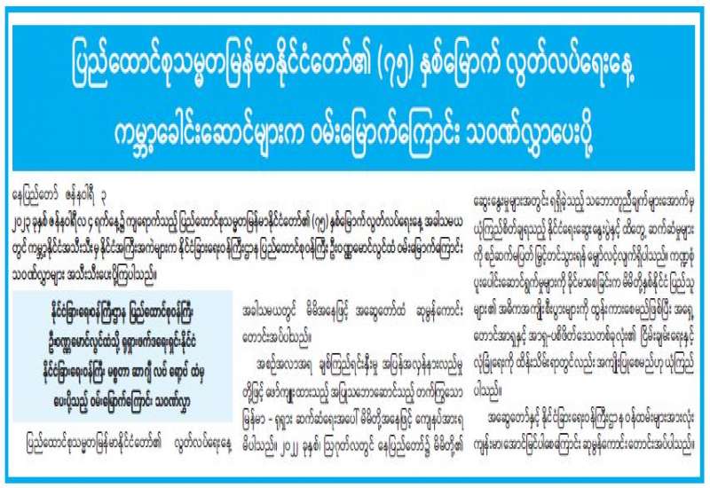 (၇၅) နှစ်မြောက် စိန်ရတုလွတ်လပ်ရေးနေ့ကို ကြိုဆိုဂုဏ်ပြုသောအားဖြင့် ဂုဏ်ပြုမိတ်ဆုံ စားပွဲနှင့် ကံစမ်းမဲဖောက်ခြင်းအစီအစဉ်များကို ယနေ့တွင် စွမ်းအင်ဝန်ကြီးဌာန ရုံးအမှတ် ၆ ၌ ကျင်းပရာ စွမ်းအင်ဝန်ကြီးဌာန ပြည်ထောင်စုဝန်ကြီး ဦးမျိုးမြင့်ဦး တက်ရောက်သည်။