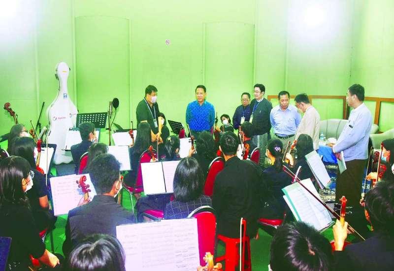 ပြန်ကားရေးဝန်ကြီးဌာန ပြည်ထောင်စုဝန်ကြီး ဦးမောင်မောင်အုန်းသည် ယနေ့ညနေပိုင်းက ရန်ကုန်မြို့ပြည်လမ်းရှိ မြန်မာ့အသံနှင့်ရုပ်မြင်သံကားတွင် (၇၅) နှစ်မြောက် စိန်ရတုလွတ်လပ်ရေးနေ့ ဂုဏ်ပြုညစာ စားပွဲ၌ ဖျော်ဖြေတင်ဆက်မည့် နိုင်ငံတော်သံစုံတီးဝိုင်း တီးခတ်လေ့ကျင့်မှုကို ကြည့်ရှုအားပေးသည်။