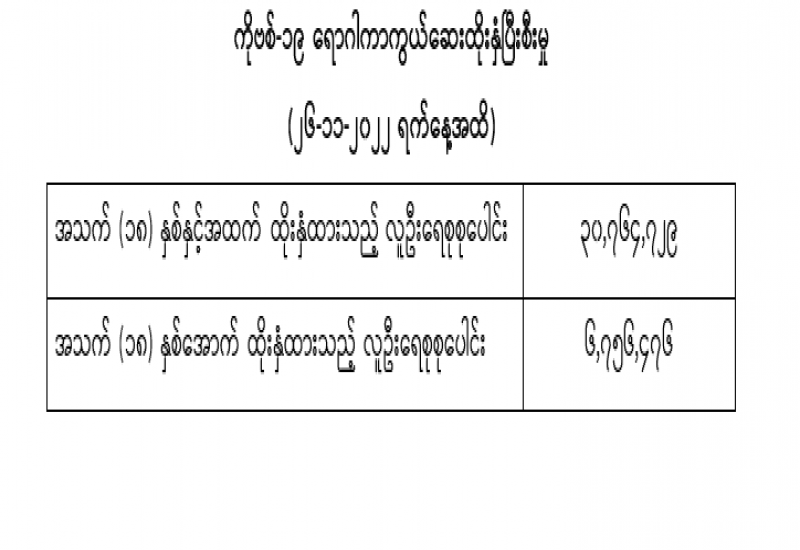 ကျန်းမာရေးဝန်ကြီးဌာနသည် COVID-19 သံသယလူနာများ၊ ဓာတ်ခွဲအတည်ပြုလူနာနှင့် အနီးကပ် ထိတွေ့ခဲ့သူများနှင့် အသွားအလာကန့်သတ်ထားရှိသူများအား COVID-19 ရောဂါ ရှိ၊ မရှိ ဓာတ်ခွဲ စစ်ဆေးခြင်း ပုံမှန်ဆောင်ရွက်လျက်ရှိပြီး (၂၆-၁၁-၂၀၂၂) ရက်နေ့၊ ည (၈:၀၀) နာရီမှ (၂၇-၁၁-၂၀၂၂) ရက်နေ့၊ ည (၈:၀၀) နာရီအတွင်း ဓာတ်ခွဲနမူနာစုစုပေါင်း (၆,၄၂၇) ခုအား စစ်ဆေးပြီးစီးခဲ့ရာ COVID-19 ရောဂါ ဓာတ်ခွဲအတည်ပြုလူနာသစ် (၁၀) ဦး တွေ့ရှိရသဖြင့် ရောဂါပိုးတွေ့ရှိမှုရာခိုင်နှုန်းမှာ (၀.၁၆) ရာခိုင်နှုန်း ရှိပါသည်။