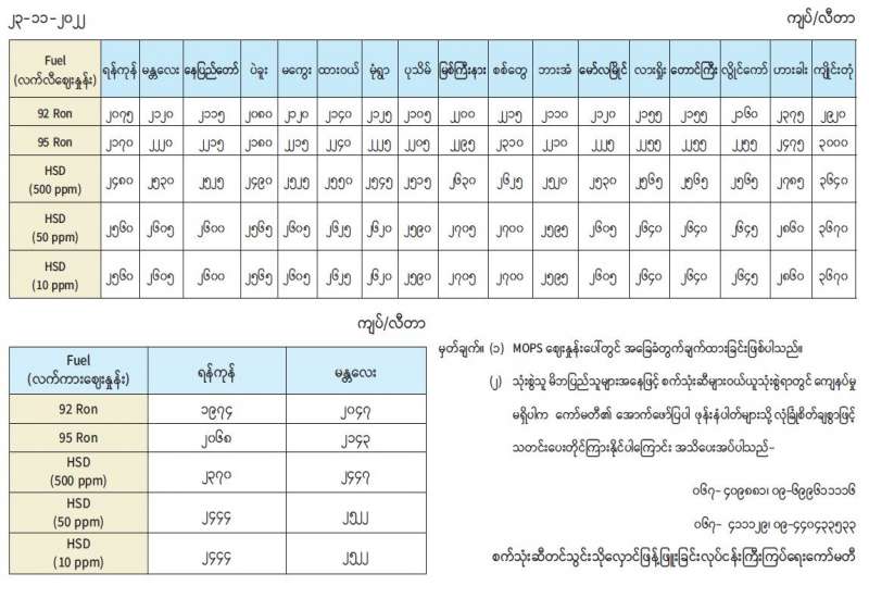 ရန်ကုန်မြို့နှင့် မန္တလေးမြို့အတွက် ရည်ညွှန်းလက်ကားဈေးနှုန်းများနှင့် ပြည်ထောင်စုနယ်မြေ နေပြည်တော်၊ တိုင်းဒေသကြီး/ ပြည်နယ် မြို့တော်များအတွက် ရည်ညွှန်းလက်လီဈေးနှုန်းများ
