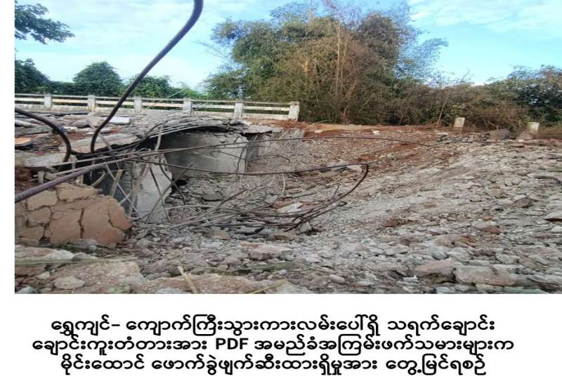 ပဲခူးတိုင်းဒေသကြီး၊ ရွှေကျင်မြို့နယ်၊ ရွှေကျင်-ကျောက်ကြီးသွား ကားလမ်းပေါ်ရှိ သရက်ချောင်း ချောင်းကူးတံတားအား ယနေ့နံနက် ၇ နာရီ ၁၀ မိနစ်ခန့်တွင် PDF အမည်ခံအကြမ်းဖက်သမားများက မိုင်းထောင်ဖောက်ခွဲဖျက်ဆီးခဲ့ကြောင်း သိရှိရသည်။