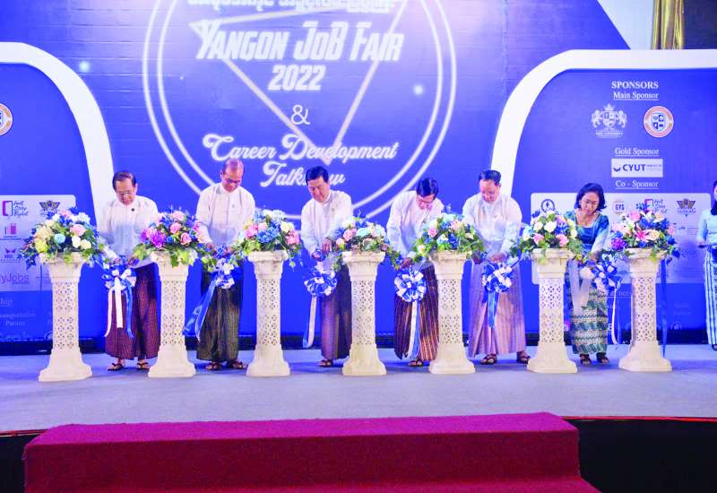 ကုမ္ပဏီ ၁၈ ခုနှင့် ပြည်တွင်း၊ ပြည်ပအလုပ်အကိုင်ရှာဖွေရေး အကျိုးဆောင်လိုင်စင်ရ အေဂျင်စီ ၁၁ ခုတို့ပါဝင်ပြသသည့် အလုပ်အကိုင်အခွင့်အလမ်းပြပွဲ ဖွင့်ပွဲအခမ်းအနားကို ယနေ့နံနက်ပိုင်းက ရန်ကုန်မြို့ရှိ Novotel Hotel ၌ ကျင်းပသည်။