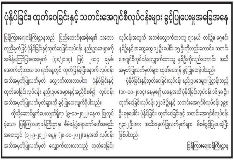 ပုံနှိပ်ခြင်း၊ ထုတ်ဝေခြင်းနှင့် သတင်းအေဂျင်စီလုပ်ငန်းများ ခွင့်ပြုပေးမှုအခြေအနေ