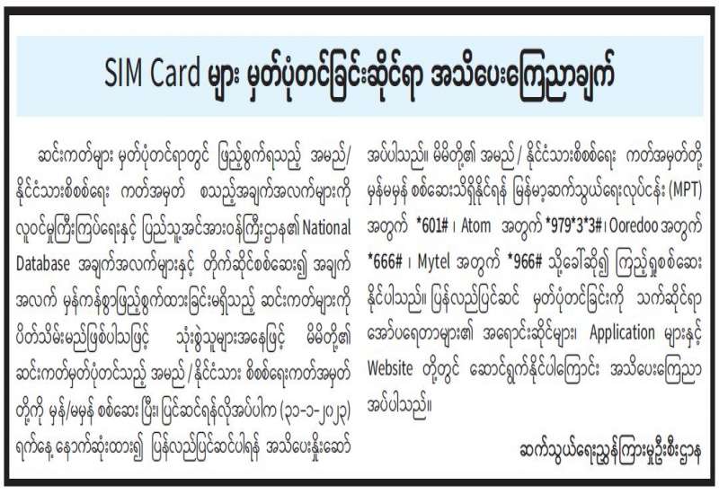 SIM Card များ မှတ်ပုံတင်ခြင်းဆိုင်ရာ အသိပေးကြေညာချက်