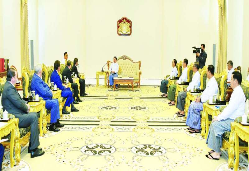 နှစ်နိုင်ငံချစ်ကြည်ရင်းနှီးမှုနှင့် ပူးပေါင်းဆောင်ရွက်မှုများ ဆက်လက်တိုးမြှင့်ရေးဆိုင်ရာ ကိစ္စရပ်များ အမြင်ချင်းဖလှယ်ဆွေးနွေး နေပြည်တော် နိုဝင်ဘာ ၁၁ နိုင်ငံတော်စီမံအုပ်ချုပ်ရေးကောင်စီဥက္ကဋ္ဌ နိုင်ငံတော်ဝန်ကြီးချုပ် ဗိုလ်ချုပ်မှူးကြီး မင်းအောင်လှိုင်ထံ ရုရှားဖက်ဒရေးရှင်းနိုင်ငံ ရော့စ်ကွန်ဂရက် ရင်းနှီးမြှုပ်နှံမှုရန်ပုံငွေအဖွဲ့မှ ညွှန်ကြားရေးမှူး SHATIROV Alexander Sergeevich ဦးဆောင်သည့် ကိုယ်စားလှယ်အဖွဲ့က ယနေ့မွန်းလွဲပိုင်းတွင် နေပြည်တော်ရှိ နိုင်ငံတော်စီမံအုပ်ချုပ်ရေးကောင်စီဥက္ကဋ္ဌရုံး ဧည့်ခန်းမ၌ လာရောက်ဂါရဝပြုတွေ့ဆုံသည်။