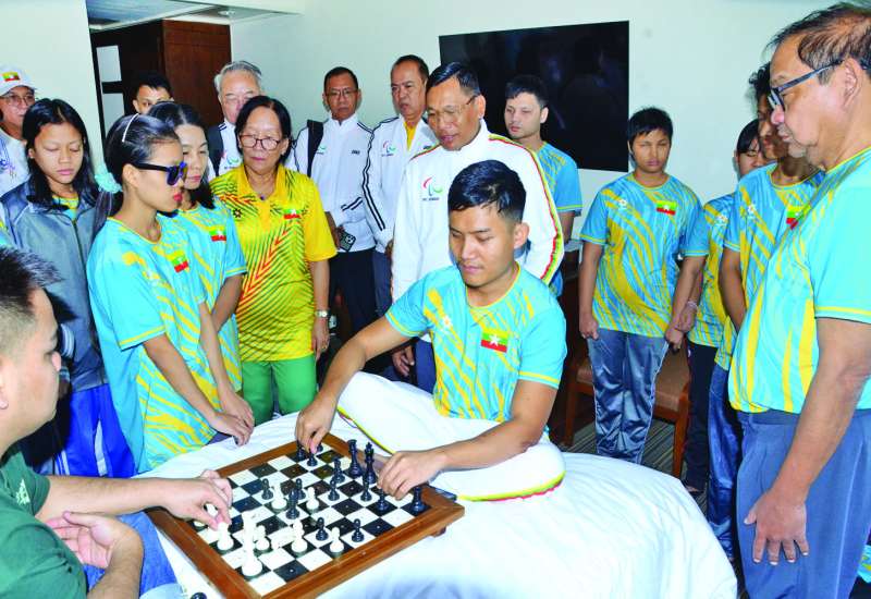 မြန်မာနိုင်ငံ မသန်စွမ်းအားကစားအဖွဲ့ချုပ်ဥက္ကဋ္ဌ ဗိုလ်ချုပ်လှမိုးနှင့် အဖွဲ့ဝင်များသည် ယနေ့တွင် 13th Asean Para Games ပြိုင်ပွဲသို့ ဝင်ရောက်ယှဉ်ပြိုင်ကြမည့် မြန်မာနိုင်ငံမသန်စွမ်းအားကစားအဖွဲ့များ၏ တည်းခိုနေထိုင်စားသောက်မှုများကို လိုက်လံကြည့်ရှုစစ်ဆေးကာ အားပေးစကားပြောကြားသည်။