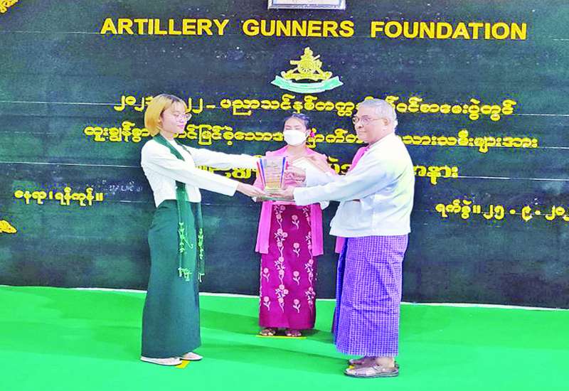 ၂၀၂၁-၂၀၂၂ ပညာသင်နှစ် တက္ကသိုလ်ဝင် စာမေးပွဲတွင် ထူးချွန်စွာ အောင်မြင်ခဲ့သည့် လေကြောင်းရန် ကာကွယ်ရေးတပ်ဖွဲ့၊ အမြောက်တပ်ဖွဲ့နှင့် ဒုံးတပ်ဖွဲ့တို့၌ တာဝန်ထမ်းဆောင်လျက်ရှိသူများ၏ သား သမီးများ၊ အငြိမ်းစားတပ်ဖွဲ့ဝင်များ၏ သားသမီးများ၊ စုစုပေါင်း ၉၈ ဦးတို့ကို Artillery Gunners Foun- dation က စက်တင်ဘာ ၂၅ ရက်တွင် နယ်မြေခံ အမြောက်တပ်ရင်း၌ ပညာရည်ချွန်ဆုပေးအပ်ပွဲ ကျင်းပသည်။