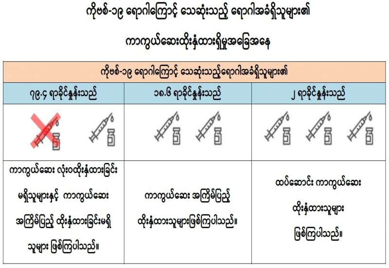 ကျန်းမာရေးဝန်ကြီးဌာနအနေဖြင့် နိုင်ငံအတွင်းကူးစက်ဖြစ်ပွားနေသော COVID-19 ရောဂါ ကာကွယ်၊ ကုသ၊ ထိန်းချုပ်ရေးလုပ်ငန်းများကို အရှိန်အဟုန်မပြတ် ဆောင်ရွက်လျက်ရှိရာ ရောဂါထိန်းချုပ်ရေးလုပ်ငန်းများ အောင်မြင်နိုင်ရေးအတွက် ပြည်သူလူထုအနေဖြင့် ကျန်းမာရေးဝန်ကြီးဌာနမှ ထုတ်ပြန်ထားသော COVID-19 ရောဂါကာကွယ်ထိန်းချုပ်ရေးဆိုင်ရာ စည်းကမ်းများကို စနစ်တကျလိုက်နာဆောင်ရွက်ရန်လိုအပ်ပြီး COVID-19 ကာကွယ်ဆေးထိုးနှံမှုခံယူခြင်းအား အထူးဂရုပြု ပူးပေါင်းဆောင်ရွက်ကြရန် လိုအပ်ပါသည်။