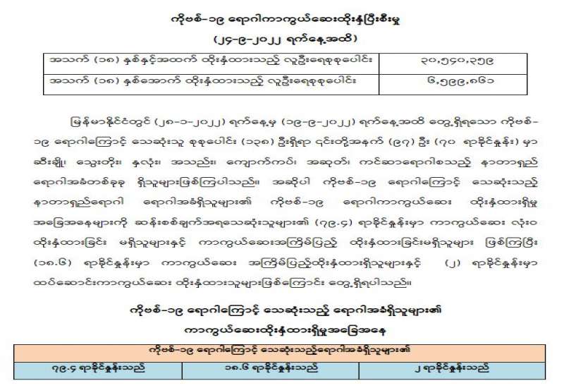 ကျန်းမာရေးဝန်ကြီးဌာနအနေဖြင့် နိုင်ငံအတွင်းကူးစက်ဖြစ်ပွားနေသော COVID-19 ရောဂါ ကာကွယ်၊ ကုသ၊ ထိန်းချုပ်ရေး လုပ်ငန်းများကို အရှိန်အဟုန်မပြတ် ဆောင်ရွက်လျက်ရှိပါသည်။