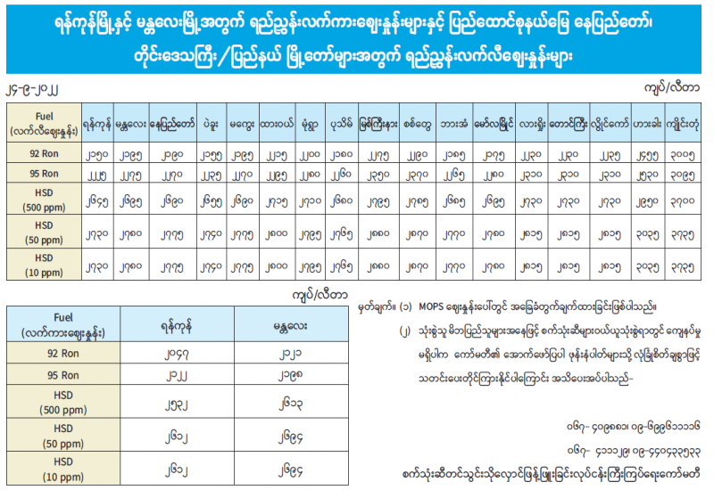 ရန်ကုန်မြို့နှင့် မန္တလေးမြို့အတွက် ရည်ညွှန်းလက်ကား ဈေးနှုန်းများနှင့် ပြည်ထောင်စုနယ်မြေ နေပြည်တော်၊ တိုင်းဒေသကြီး/ပြည်နယ် မြို့တော်များအတွက် ရည်ညွှန်းလက်လီဈေးနှုန်းများ