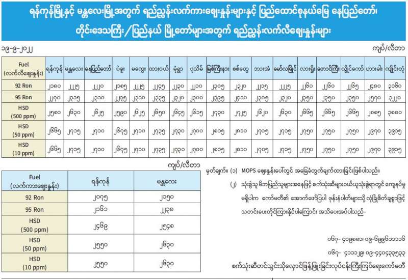 ရန်ကုန်မြို့နှင့် မန္တလေးမြို့အတွက် ရည်ညွှန်းလက်ကားဈေးနှုန်းများနှင့် ပြည်ထောင်စုနယ်မြေ နေပြည်တော်၊ တိုင်းဒေသကြီ/ ပြည်နယ် မြို့တော်များအတွက် ရည်ညွှန်းလက်လီဈေးနှုန်းများ