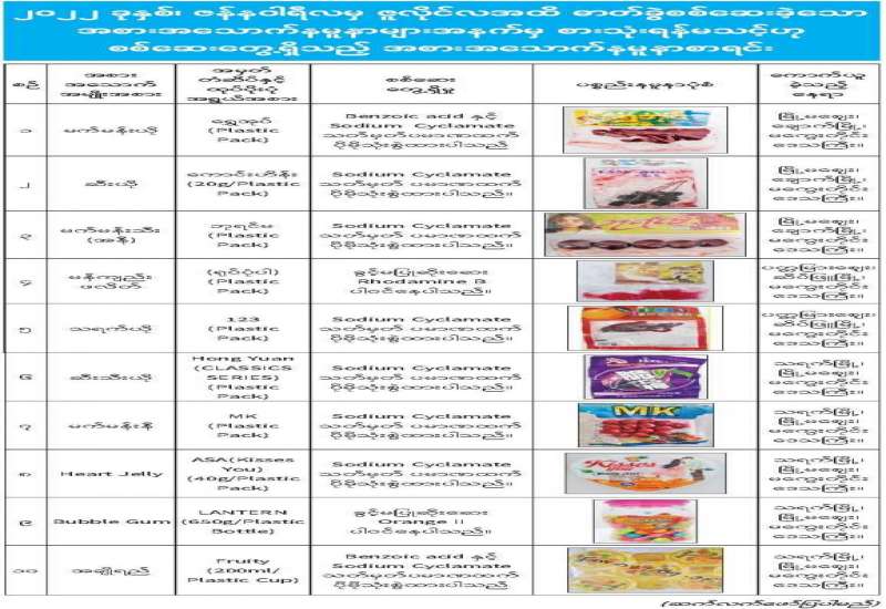 ၂၀၂၂ ခုနှစ်၊ ဇန်နဝါရီလမှ ဇူလိုင်လအထိ ဓာတ်ခွဲစစ်ဆေးခဲ့သော အစားအသောက်နမူနာများအနက်မှ စားသုံးရန်မသင့်ဟု စစ်ဆေးတွေ့ရှိသည့် အစားအသောက်နမူနာစာရင်း
