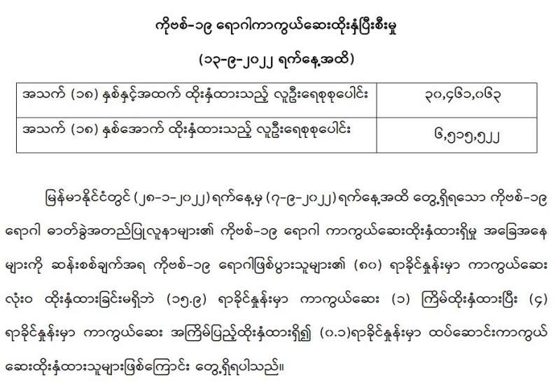 ကျန်းမာရေးဝန်ကြီးဌာနအနေဖြင့် နိုင်ငံအတွင်း ကူးစက်ဖြစ်ပွားနေသော COVID-19 ရောဂါ ကာကွယ်၊ ကုသ၊ ထိန်းချုပ်ရေးလုပ်ငန်းများကို အရှိန်အဟုန်မပြတ် ဆောင်ရွက်လျက်ရှိရာ ရောဂါထိန်းချုပ်ရေးလုပ်ငန်းများ အောင်မြင်နိုင်ရေးအတွက် ပြည်သူလူထုအနေဖြင့် ကျန်းမာရေးဝန်ကြီးဌာနမှ ထုတ်ပြန်ထားသော COVID-19 ရောဂါကာကွယ်ထိန်းချုပ်ရေးဆိုင်ရာ စည်းကမ်းများကို စနစ်တကျ လိုက်နာဆောင်ရွက်ရန်လိုအပ်ပြီး COVID-19 ကာကွယ်ဆေးထိုးနှံမှု ခံယူခြင်းအား အထူးဂရုပြု ပူးပေါင်းဆောင်ရွက်ကြရန် လိုအပ်ပါသည်။