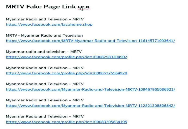 “ပြန်ကြားရေးဝန်ကြီးဌာန၊ မြန်မာ့အသံနှင့် ရုပ်မြင်သံကြားက အများ ပြည်သူအတွက် ထုတ်လွှင့် ဝန်ဆောင်မှုပေးလျက်ရှိသည့် MRTV HD နှင့် ဆက်စပ်ရုပ်သံလိုင်းများ၏ ရုပ်သံအစီအစဉ်များကို MRTV Media Application တွင် အကြောင်းအရာအလိုက် ကဏ္ဍခွဲ ၁၁ ခုဖြင့် ထုတ်လွှင့်ဖော်ပြလျက်ရှိရာ အဆိုပါ MRTV Media Application ၏ Logo ကို profile ပုံအဖြစ်လည်းကောင်း၊ MRTV ၏ logo အဟောင်းကို Cover photo အဖြစ်လည်းကောင်း ရယူတုပအသုံးပြု၍ “Myanmar Radio and Television” အမည် Facebook Page ဖြင့် ညစ်ညမ်းပစ္စည်းများရောင်းချနေမှုကို စိစစ်တွေ့ရှိရပါသည်။