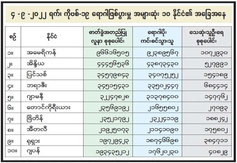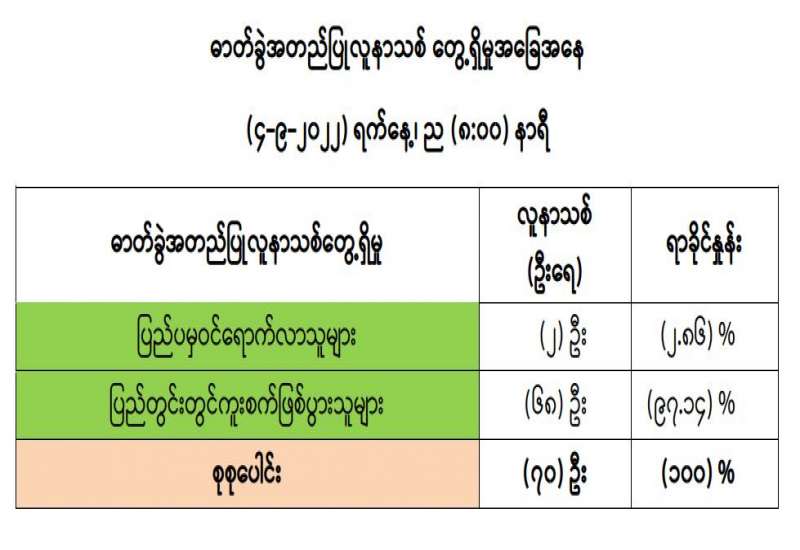 ကျန်းမာရေးဝန်ကြီးဌာနအနေဖြင့် နိုင်ငံအတွင်း ကူးစက်ဖြစ်ပွားနေသော COVID-19 ရောဂါ ကာကွယ်၊ ကုသ၊ ထိန်းချုပ်ရေးလုပ်ငန်းများကို အရှိန်အဟုန်မပြတ် ဆောင်ရွက်လျက်ရှိရာ ရောဂါထိန်းချုပ်ရေးလုပ်ငန်းများ အောင်မြင်နိုင်ရေးအတွက် ပြည်သူလူထုအနေဖြင့် ကျန်းမာရေးဝန်ကြီးဌာနမှ ထုတ်ပြန်ထားသော COVID-19 ရောဂါကာကွယ်ထိန်းချုပ်ရေးဆိုင်ရာ စည်းကမ်းများကို စနစ်တကျလိုက်နာဆောင်ရွက်ရန် လိုအပ်ပြီး COVID-19 ကာကွယ်ဆေးထိုးနှံမှု ခံယူခြင်းအား အထူးဂရုပြု ပူးပေါင်းဆောင်ရွက်ကြရန် လိုအပ်ပါသည်။
