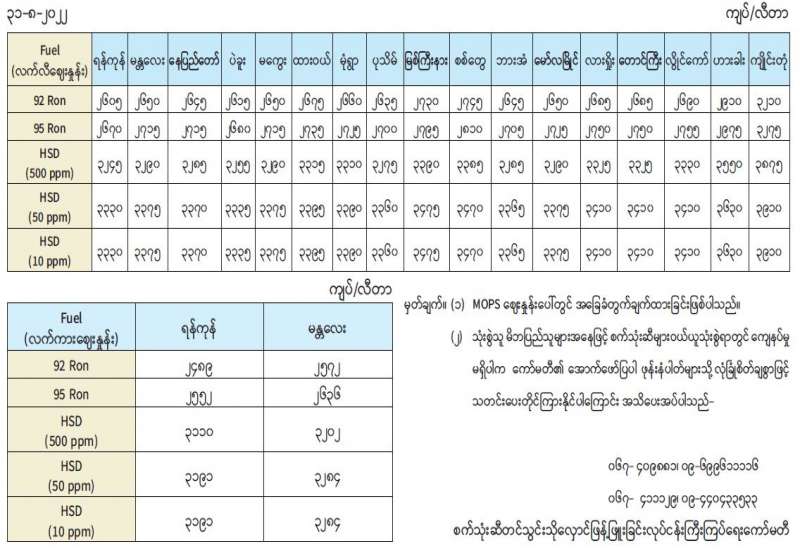 ရန်ကုန်မြို့နှင့် မန္တလေးမြို့အတွက် ရည်ညွှန်းလက်ကားဈေးနှုန်းများနှင့် ပြည်ထောင်စုနယ်မြေ နေပြည်တော်၊ တိုင်းဒေသကြီး/ ပြည်နယ် မြို့တော်များအတွက် ရည်ညွှန်းလက်လီဈေးနှုန်းများ