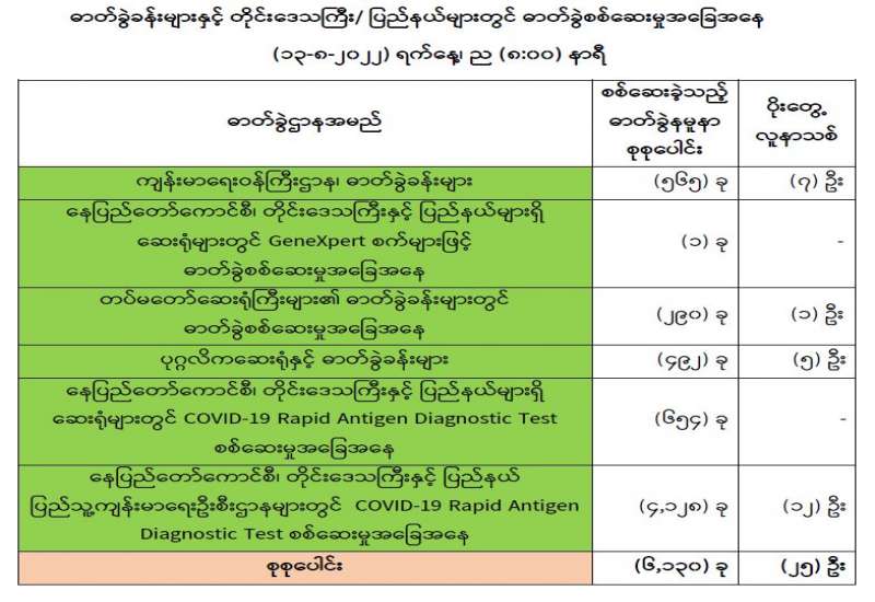 ကျန်းမာရေးဝန်ကြီးဌာနအနေဖြင့် နိုင်ငံအတွင်း ကူးစက်ဖြစ်ပွားနေသော COVID-19 ရောဂါ ကာကွယ်၊ ကုသ၊ ထိန်းချုပ်ရေးလုပ်ငန်းများကို အရှိန်အဟုန်မပြတ် ဆောင်ရွက်လျက်ရှိပါသည်။