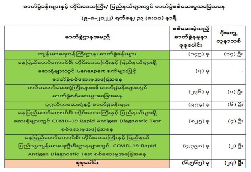ကျန်းမာရေးဝန်ကြီးဌာနအနေဖြင့် နိုင်ငံအတွင်း ကူးစက်ဖြစ်ပွားနေသော COVID-19 ရောဂါ ကာကွယ်၊ ကုသ၊ ထိန်းချုပ်ရေးလုပ်ငန်းများကို အရှိန်အဟုန်မပြတ် ဆောင်ရွက်လျက်ရှိပါသည်။