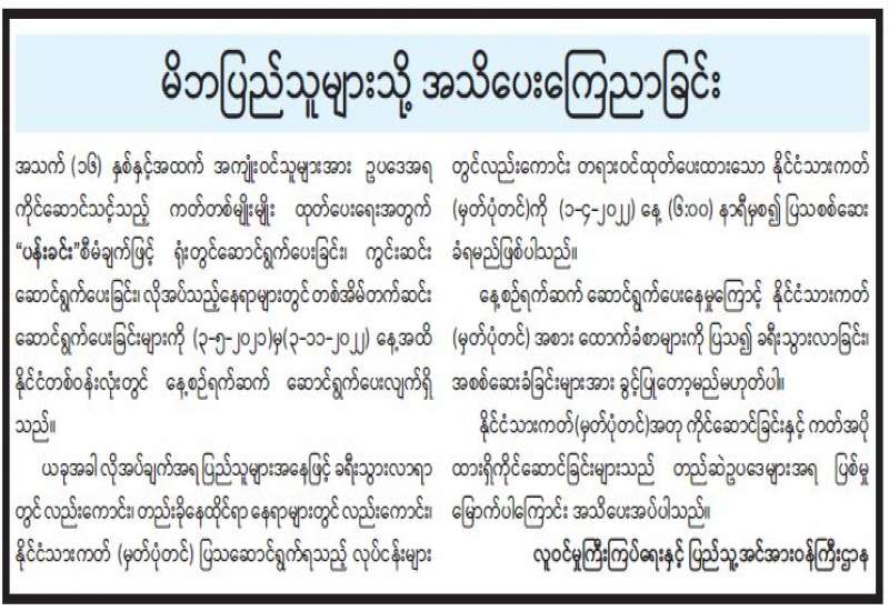 “ရွေးကောက်ပွဲဟာ တိုင်းပြည်ရဲ့ ဂုဏ်သိက္ခာနဲ့သက်ဆိုင်တဲ့ အမျိုးသားရေး တာဝန်တစ်ရပ် ဖြစ်ပါတယ်။ လွတ်လပ်ပြီးတရားမျှတမှသာ ပြည်သူတွေလိုလားတောင့်တတဲ့ ပါတီစုံဒီမိုကရေစီစနစ်ခိုင်မြဲစေပြီး နိုင်ငံရဲ့နိုင်ငံရေးသမိုင်းနဲ့ နိုင်ငံတကာအသိုင်းအဝိုင်းမှာလည်း ဂုဏ်သိက္ခာမြင့်မားစေမှာဖြစ်ပါတယ်။ ရွေးကောက်ပွဲမှာ ရွေးကောက်ပွဲဆိုင်ရာ ပြစ်မှုတွေကို ကျူးလွန်ခြင်း၊ နည်းမျိုးစုံနဲ့ မသမာမှုလုပ်ဆောင်ခြင်း စတာတွေ ပေါ်ပေါက်လာတယ်ဆိုရင်တော့ နိုင်ငံရဲ့ပုံရိပ်ကျဆင်းစေပြီး နိုင်ငံရဲ့ဒီမိုကရေစီခရီးလမ်းဟာလည်း အနုတ်လက္ခဏာဆောင်မှာဖြစ်ပါတယ်”ဟု နိုင်ငံတော် စီမံအုပ်ချုပ်ရေးကောင်စီဥက္ကဋ္ဌ နိုင်ငံတော်ဝန်ကြီးချုပ်က နိုင်ငံတော်စီမံအုပ်ချုပ်ရေးကောင်စီ၏ ၁ နှစ်နှင့် ၆ လပြည့်နေ့တွင် ပြောကြားခဲ့သည်။