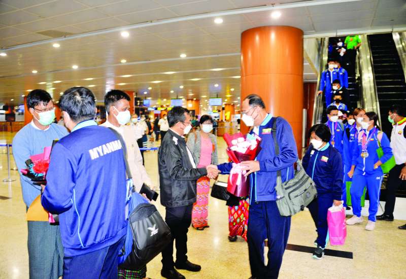 အကြိမ်(၂၀)မြောက် အာဆီယံတက္ကသိုလ်များ အားကစားပြိုင်ပွဲသို့ ဝင်ရောက်ယှဉ်ပြိုင်ခဲ့သော မြန်မာနိုင်ငံတက္ကသိုလ်ဝူရှူး အားကစားအဖွဲ့သည် ယနေ့ညနေ ၆ နာရီတွင် ရန်ကုန်မြို့သို့ ပြန်လည်ရောက်ရှိကြရာ ရန်ကုန်တိုင်းဒေသကြီးရှိ ပါမောက္ခချုပ်များနှင့် ပညာရေးဝန်ကြီးဌာနမှ တာဝန်ရှိသူများ၊ အားကစားဝန်ကြီးဌာန ဒုတိယညွှန်ကြားရေးမှူးချုပ်၊ မြန်မာနိုင်ငံ ဝူရှူးအားကစားအဖွဲ့ချုပ် ဥက္ကဋ္ဌနှင့် တာဝန်ရှိသူများ၊ ကျောင်းသား ကျောင်းသူများက လေဆိပ်တွင် လှိုက်လှဲစွာကြိုဆိုခဲ့ကြသည်။