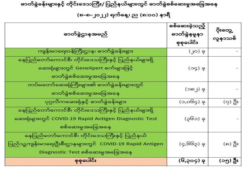 ကျန်းမာရေးဝန်ကြီးဌာနအနေဖြင့် နိုင်ငံအတွင်း ကူးစက်ဖြစ်ပွားနေသော COVID-19 ရောဂါ ကာကွယ်၊ ကုသ၊ ထိန်းချုပ်ရေးလုပ်ငန်းများကို အရှိန်အဟုန်မပြတ် ဆောင်ရွက်လျက်ရှိပါသည်။