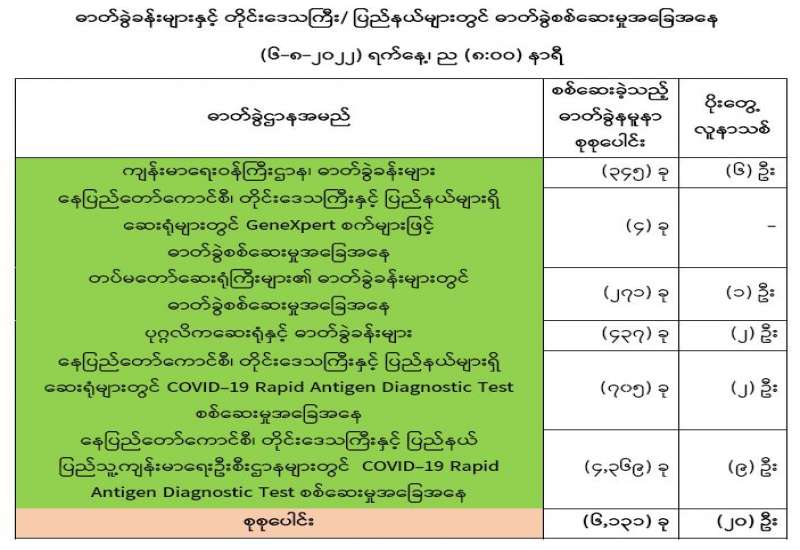 ကျန်းမာရေးဝန်ကြီးဌာနအနေဖြင့် နိုင်ငံအတွင်း ကူးစက်ဖြစ်ပွားနေသော COVID-19 ရောဂါ ကာကွယ်၊ ကုသ၊ ထိန်းချုပ်ရေးလုပ်ငန်းများကို အရှိန်အဟုန်မပြတ် ဆောင်ရွက်လျက်ရှိပါသည်။