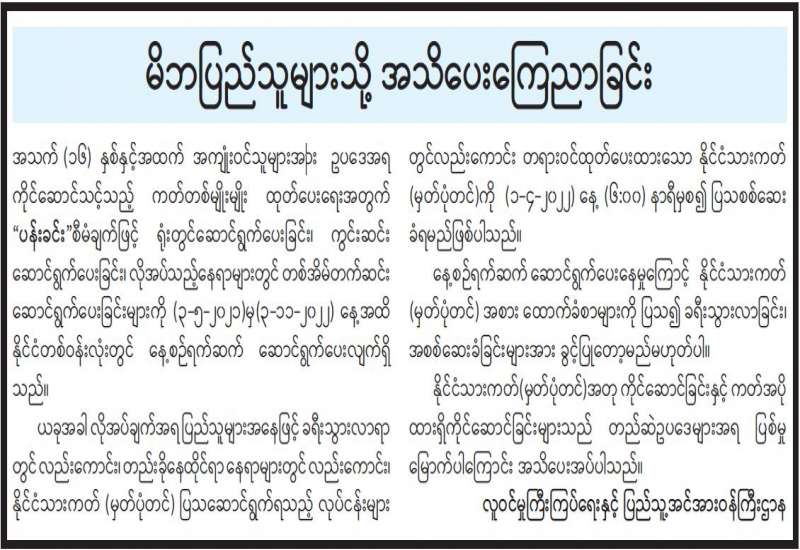 နယ်စပ်ဒေသအသီးသီးနှင့် အချို့သော တိုင်းရင်းသားလက်နက်ကိုင်အဖွဲ့များအတွင်းသို့ ရောက်ရှိနေသည့် CDM ဝန်ထမ်းများ၊ ကျောင်းသား၊ကျောင်းသူများနှင့် လူငယ်၊လူရွယ်များအား နယ်စပ်ကြိုဆိုရေး စခန်းအသီးသီးနှင့် နီးစပ်ရာတပ်မတော်၊ မြန်မာနိုင်ငံ ရဲတပ်ဖွဲ့စခန်းအသီးသီးသို့ ဆက်သွယ်၍ ဥပဒေဘောင်အတွင်း ပြန်လည်ဝင်ရောက်နိုင်ကြောင်းနှင့် ယင်းသို့ သတင်းပို့ ဆက်သွယ်သူများကို သတ်မှတ်စည်းကမ်းချက်များနှင့်အညီ နေ့စဉ်ပြည်သူ့ဘဝတွင် အေးချမ်းစွာ နေထိုင်နိုင်ရေး အာမခံချက်ပေးသွားမည်ဖြစ်ကြောင်း နိုင်ငံတော်စီမံအုပ်ချုပ်ရေးကောင်စီ သတင်းထုတ်ပြန်ရေးအဖွဲ့က အသိပေး ထုတ်ပြန်ထားရှိပြီး ဖြစ်ပါသည်။