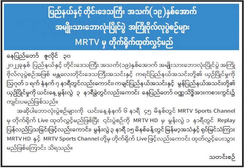 ပြည်နယ်နှင့် တိုင်းဒေသကြီး အသက်(၁၉)နှစ်အောက် အမျိုးသားဘောလုံးပြိုင်ပွဲ အကြိုဗိုလ်လုပွဲစဉ်များ MRTV မှ တိုက်ရိုက်ထုတ်လွှင့်မည်