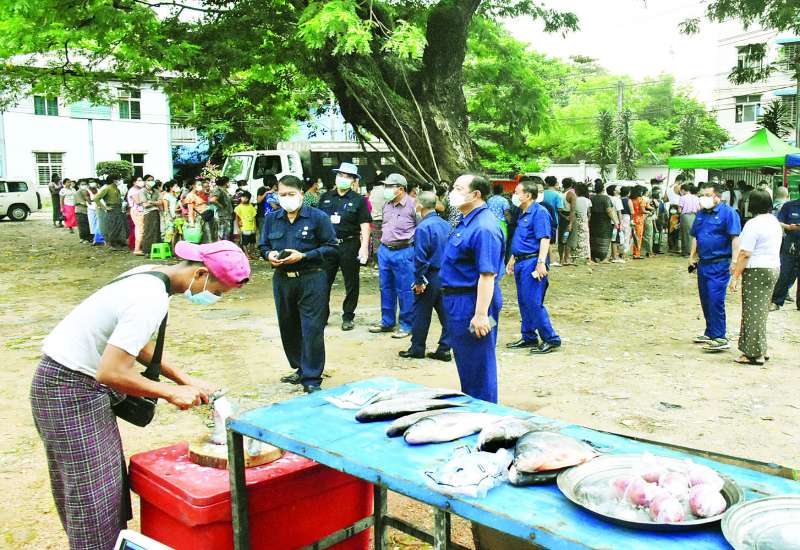 ရန်ကုန်တိုင်းဒေသကြီး စည်ပင်သာယာရေးဝန်ကြီး၊ ရန်ကုန်မြို့တော်စည်ပင်သာယာရေးကော်မတီဥက္ကဋ္ဌ (မြို့တော်ဝန်)ဦးဗိုလ်ဌေးသည် အတွင်းရေးမှူး ဦးညွန့်ဖေနှင့်အတူ ယနေ့နံနက်ပိုင်းက မင်္ဂလာတောင်ညွန့်မြို့နယ် စက်ရုံလမ်းရှိ မအူကုန်းစည်ပင်ဝန်ထမ်းအိမ်ရာဝင်းအတွင်း ရွေ့လျားဈေးကား(Mobile Market)စနစ်ဖြင့် ကုန်စိမ်း၊ ကုန်ခြောက်မျိုးစုံ၊ အသားမျိုးစုံနှင့် ငါး/ပုစွန်အမျိုးမျိုးတို့ကို ဈေးနှုန်းသက်သာစွာဖြင့် ဝယ်ယူနိုင်ရန် ရောင်းချပေးနေမှုကို သွားရောက်ကြည့်ရှုစစ်ဆေးပြီး ကျန်းမာရေးဝန်ကြီးဌာနက ထုတ်ပြန်ထားသော ညွှန်ကြားချက်များ၊ အသိပေးချက်များကို လိုက်နာ၍ ဈေးရောင်း/ဈေးဝယ် ပြုလုပ်ကြရန်မှာကြားပြီး Mask များ ဝေငှသည်။